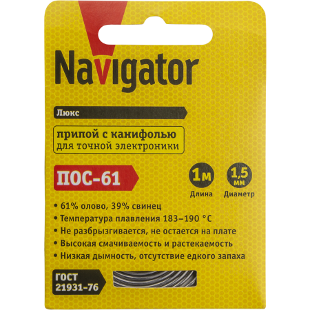 Припои с канифолью ПОС-61 Navigator предназначены для пайки и лужения радио- и электро-аппаратуры, печатных схем, где недопустим перегрев.