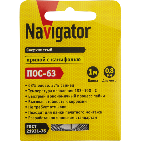 Припои с канифолью ПОС-63 Navigator предназначены для пайки и лужения радио- и электроаппаратуры, печатных схем, где недопустим перегрев.