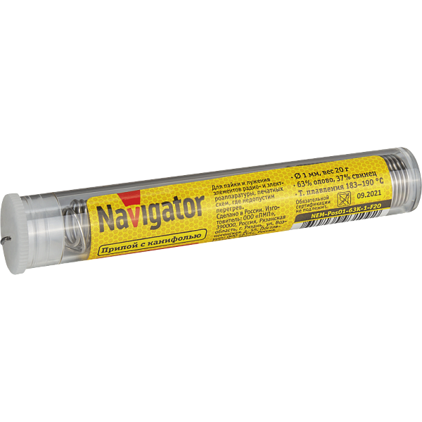Припои с канифолью ПОС-63 Navigator предназначены для пайки и лужения радио- и электроаппаратуры, печатных схем, где недопустим перегрев.