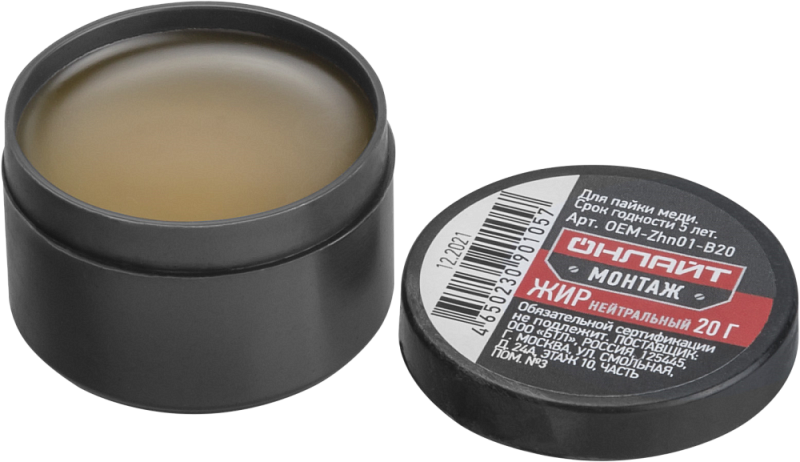 Жир паяльный нейтральный Онлайт Монтаж предназначен для пайки меди низкотемпературными припоями.