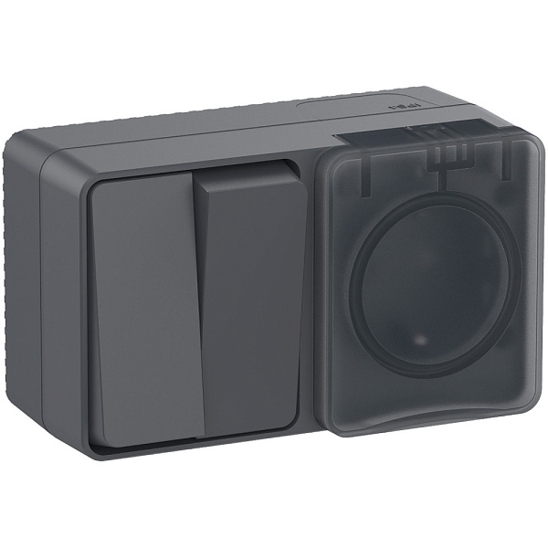 Блок для открытого монтажа из розетки с заземлением со шторками (16А, 250В) и 2-клавишного выключателя (10А).