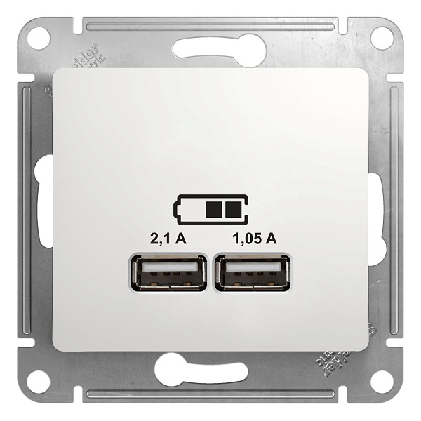 Механизм Systeme Electric серии Glossa (цвет белый) розетки с двумя разъёмами USB с выходными напряжением 5 В постоянного тока и выходами с номинальным током по 2,1 А.