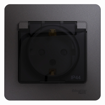 Розетка Systeme Electric (ранее Schneider Electric) серии Glossa (в сборе, цвет графит) одинарная с заземлением, шторками и крышкой подходит для сетей 250 В, на ток 16 А.