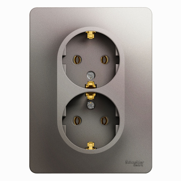 Розетка двойная Systeme Electric (ранее Schneider Electric) серии Glossa (в сборе, цвет платина) с заземлением, без шторок подходит для сетей 250 В, на ток 16 А.