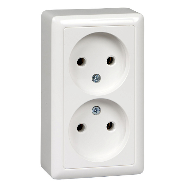 Розетка Systeme Electric (ранее Schneider Electric) Хит (открытой установки, цвет белый) двойная без заземления и без шторок предназначена для сетей до 250 В на ток до 16 А.