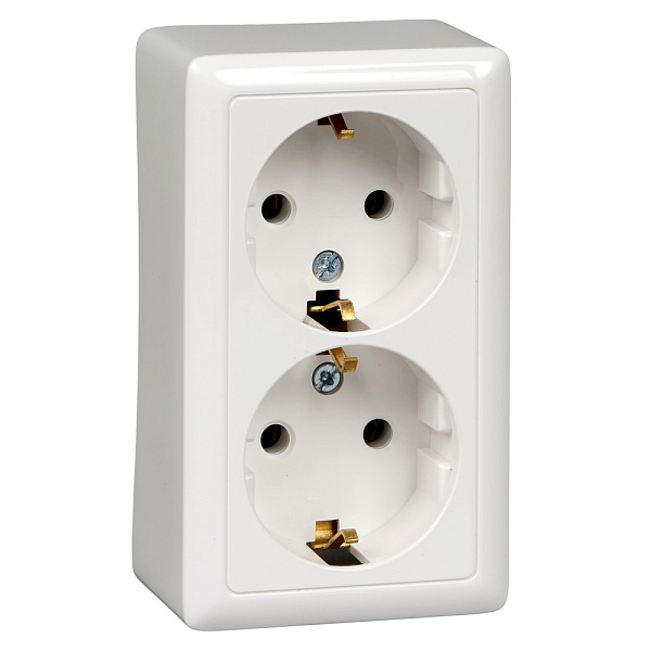 Розетка Systeme Electric (ранее Schneider Electric) ХИТ (открытой установки, цвет белый) двойная с заземлением без шторок предназначена для сетей до 250 В на ток до 16 А.