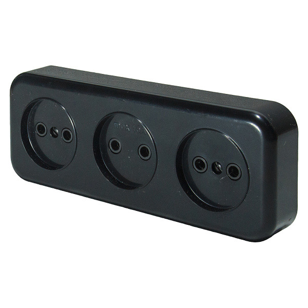 Трехместная розетка штепсельная двухполюсная открытой установки предназначена для присоединения электрических приемников с номинальным напряжением 250 В к электрической сети переменного тока в нормальных климатических условиях внешней среды по ГОСТ 15150 и ГОСТ 15543.