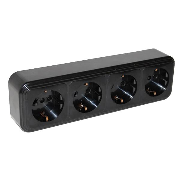 Четырехместная розетка штепсельная двухполюсная открытой установки с заземляющим контактом предназначена для присоединения электрических приемников с номинальным напряжением 250 В к электрической сети переменного тока в нормальных климатических условиях внешней среды по ГОСТ 15150 и ГОСТ 15543.