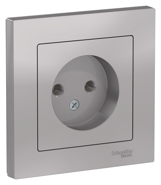 Розетка в сборе Systeme Electric (ранее Schneider Electric) серии AtlasDesign в цвете алюминий одинарная без заземления и без шторок подходит для сетей 250 В, на ток 16 А.