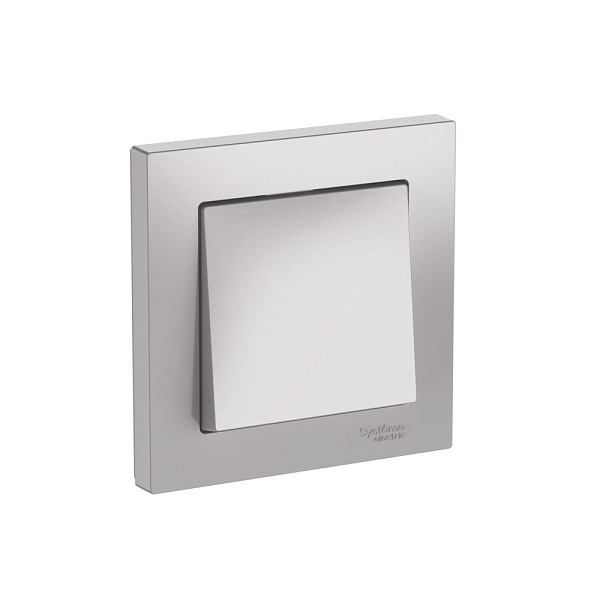 Механизм с быстрозажимными клеммами 1-клавишного выключателя в сборе Systeme Electric (ранее Schneider Electric) серии AtlasDesign в цвете алюминий подходит для сетей 250 В, на ток 10 А.