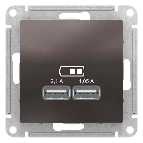 Механизм Systeme Electric (ранее Schneider Electric) серии AtlasDesign розетки для зарядки с двумя разъёмами USB с выходными напряжением 5 В постоянного тока и выходами с номинальным током по 2,1 А.