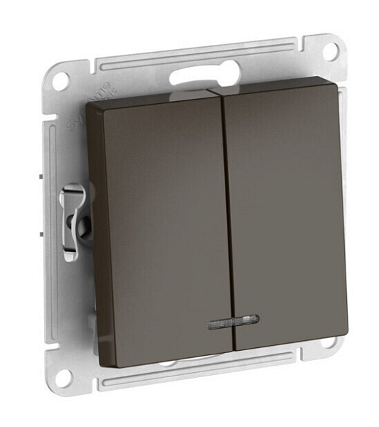 Механизм с быстрозажимными клеммами Systeme Electric (ранее Schneider Electric) серии AtlasDesign в цвете мокко 2-клавишного выключателя с подсветкой подходит для сетей 250 В, на ток 10 А.