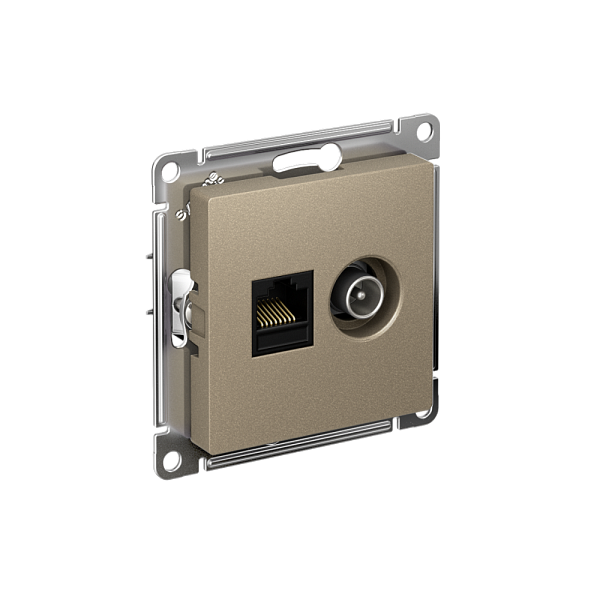 Механизм Systeme Electric (ранее Schneider Electric) серии AtlasDesign в цвете шампань двойной розетки разъёмами RJ45 категории 5е и TV предназначен для удобного и быстрого подключения вашего компьютера и телевизора к соответствующим сетям.