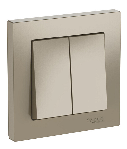 Механизм с быстрозажимными клеммами Systeme Electric (ранее Schneider Electric) серии AtlasDesign в цвете шампань 2-клавишного выключателя в сборе подходит для сетей 250 В, на ток 10 А.