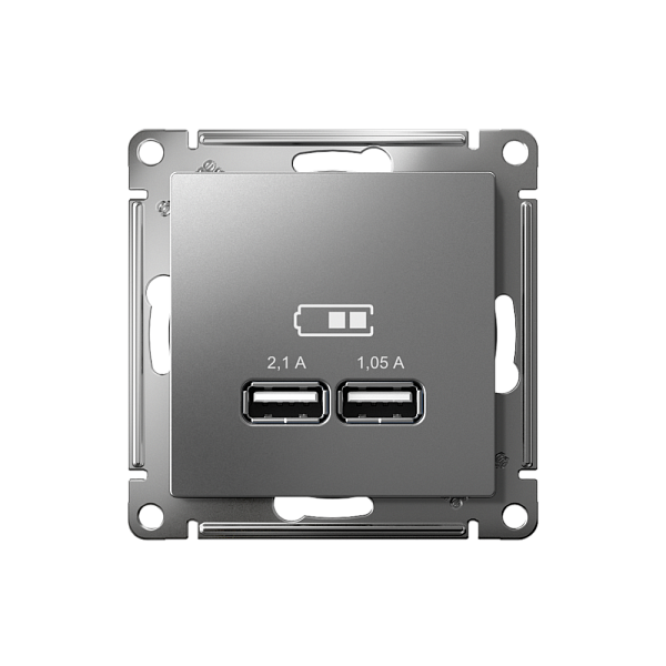 Механизм Systeme Electric (ранее Schneider Electric) серии AtlasDesign в цвете сталь розетки для зарядки с двумя разъёмами USB, с выходным напряжением 5 В постоянного тока и выходами с номинальным током по 2,1 А.