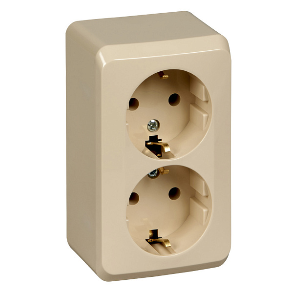 Розетка Systeme Electric (ранее Schneider Electric) ЭТЮД (кремовый, открытой установки) двухместная с заземлением, без шторок предназначена для применения в сетях до 250В, на ток до 16А.