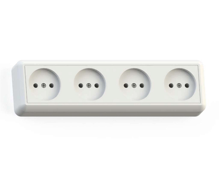 Серия ОПТИМА розетка 4-х местная без заземления вид проводки: открытая Номинальное напряжение 220 В.