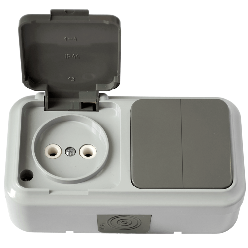 Выключатель двухклавишный + розетка брызгозащищенный открытой установки Пралеска ( Аква) "БелТИЗ"