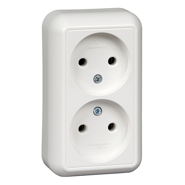 Розетка двойная Schneider Electric Прима (открытой установки, цвет белый) без заземления и без шторок, с монтажной стальной пластиной предназначена для сетей до 250 В на ток до 16 А.