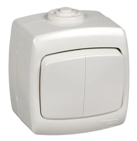 Выключатель двухклавишный Schneider Electric РОНДО (открытой установки, цвет белый) предназначен для сетей до 250 В, на ток до 10 А.