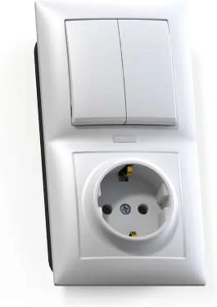 Блок комбинированный выключатель двухклавишный с подсветкой + розетка с заземляющим контактом Номинальный ток: — выключателя — 10А — розетки — 16А размер 80,4×150,4×45,4мм