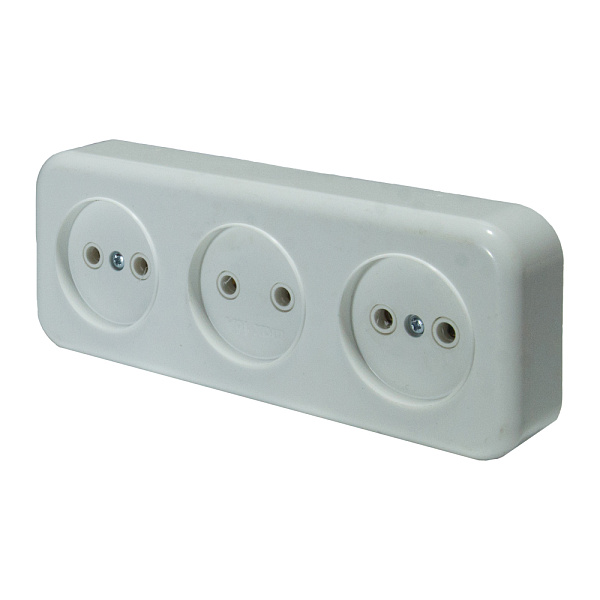 Трехместная розетка штепсельная двухполюсная открытой установки предназначена для присоединения электрических приемников с номинальным напряжением 250 В к электрической сети переменного тока в нормальных климатических условиях внешней среды по ГОСТ 15150 и ГОСТ 15543.