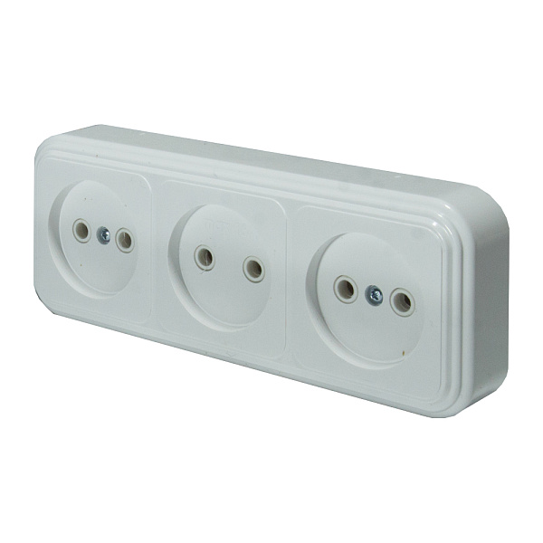 Трехместная розетка штепсельная двухполюсная открытой установки предназначена для присоединения электрических приемников с номинальным напряжением 250 В к электрической сети переменного тока в нормальных климатических условиях внешней среды по ГОСТ 15150 и ГОСТ 15543.