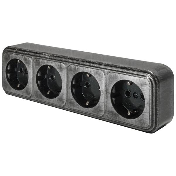 Четырехместная розетка штепсельная двухполюсная открытой установки с заземляющим контактом предназначена для присоединения электрических приемников с номинальным напряжением 250 В к электрической сети переменного тока в нормальных климатических условиях внешней среды по ГОСТ 15150 и ГОСТ 15543.