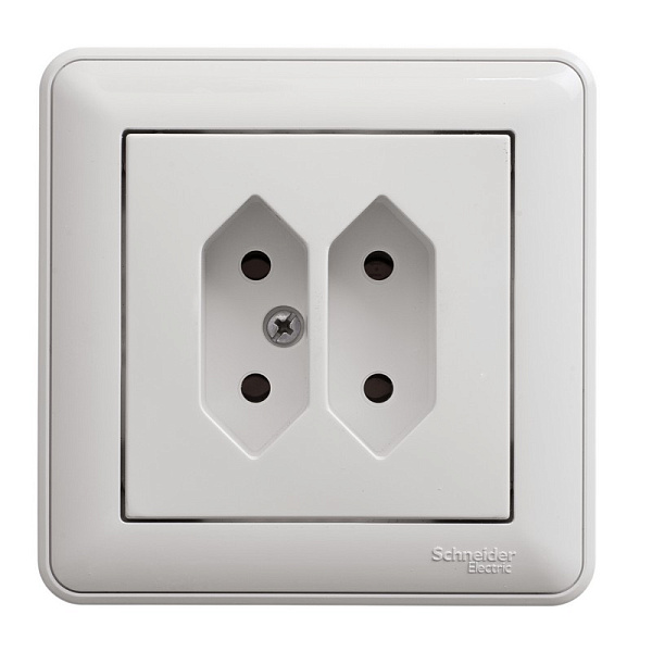 Розетка Schneider Electric W59 (в сборе, цвет белый) двойная под плоские вилки без шторок предназначен для сетей до 250 В и на ток 6 А.