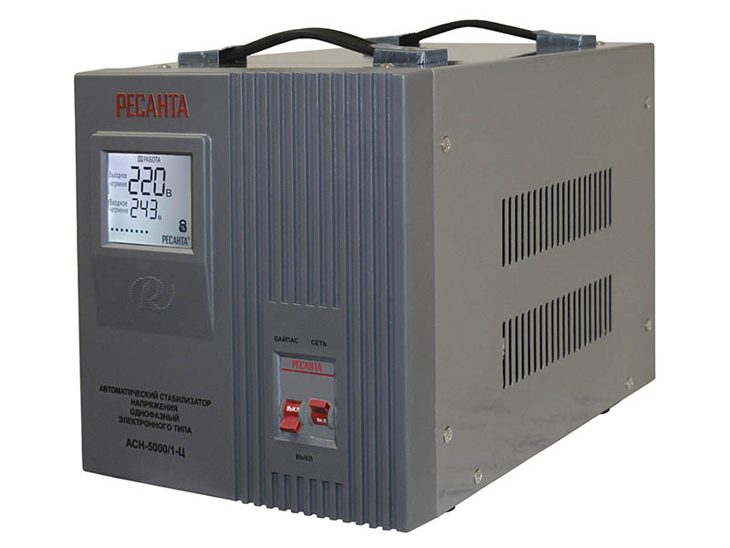 Стабилизатор напряжения Ресанта АСН 5000/1-Ц релейного типа предназначен для выравнивания входного напряжения и защиты приборов от перепадов напряжения с суммарной мощностью до 5 кВт.