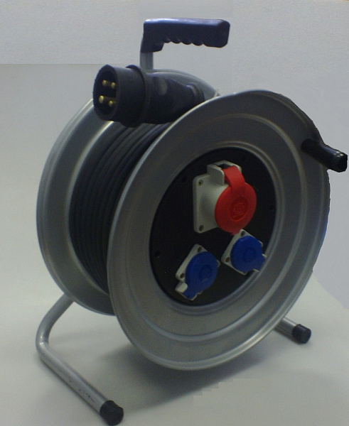 4-х местный удлинитель с заземляющим контактом на металлической катушке и металлической стойке.