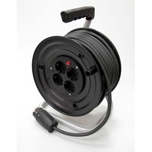 4-х местный удлинитель с заземляющим контактом на металлической катушке и металлической стойке.