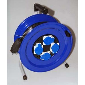 4-х местный удлинитель с заземляющим контактом на металлической катушке и металлической стойке.