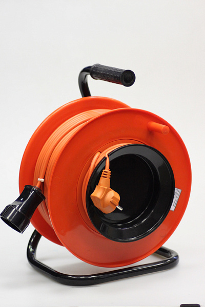 Удлинитель на пластиковой катушке на металлической стойке с 1-местной выносной розеткой.