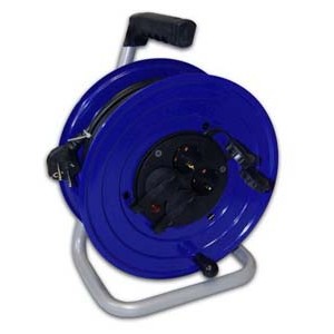 4-х местный удлинитель с заземляющим контактом на металлической катушке и металлической стойке.