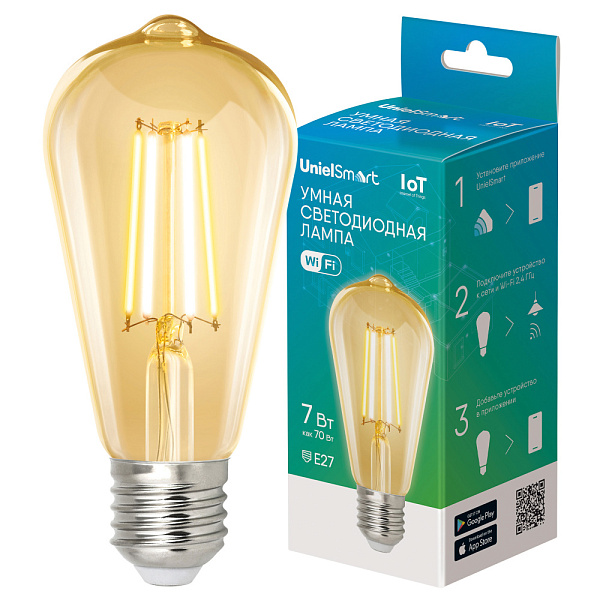 Умная светодиодная филаментная лампа с золотистой стеклянной колбой LED-ST64-7W/SW/E27/230V/WF GLS82GO мощность 7 Вт со встроенным модулем Wi-Fi предназначена для дистанционного управления освещением через приложение UNIEL Smart.