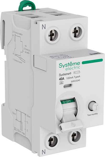 Выключатель дифференциального тока (ВДТ) или устройство защитного отключения (УЗО) S9R, серии Systeme9, Systeme Electric, 2-полюсный, номинальный ток 40 А, ток утечки = 100 мА, тип A.