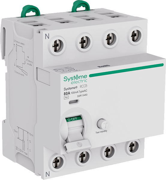 Выключатель дифференциального тока (ВДТ) или устройство защитного отключения (УЗО) S9R, серии Systeme9, Systeme Electric, 4-полюсный, номинальный ток 80 А, ток утечки = 100 мА, тип AC.