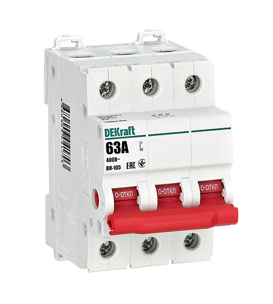 Выключатель-разъединитель серии ВН-105 Dekraft, 3-полюсный; номинальный ток 63 А, установка – на 35мм DIN-рейку, установочное положение - любое, с красной рукояткой управления.