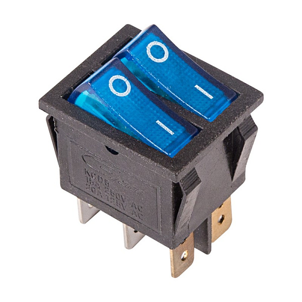 Выключатель клавишный 250V 15А (6с) ON-OFF синий с подсветкой ДВОЙНОЙ предназначен для коммутации электрических цепей переменного тока напряжением до 250В.