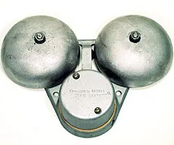 Звонок электромагнитный, корпус и крышка металлические имеют порошково-полимерное покрытие, с двумя аллюминиевыми чашами.